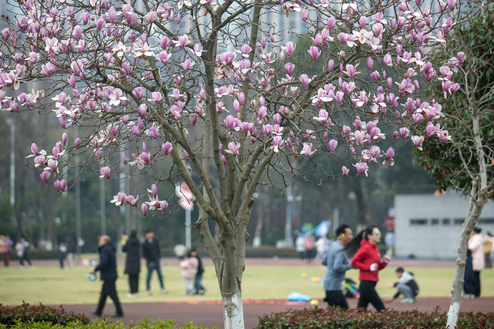 ↑3月19日,人们跑步经过浙江省宁波市奉化区林家村的一片桃园。