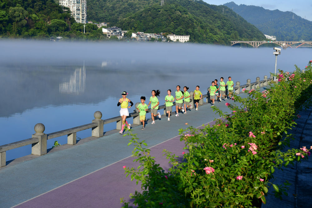 ↑8月8日,健身爱好者在浙江省建德市新安江畔的新安绿道上晨跑。