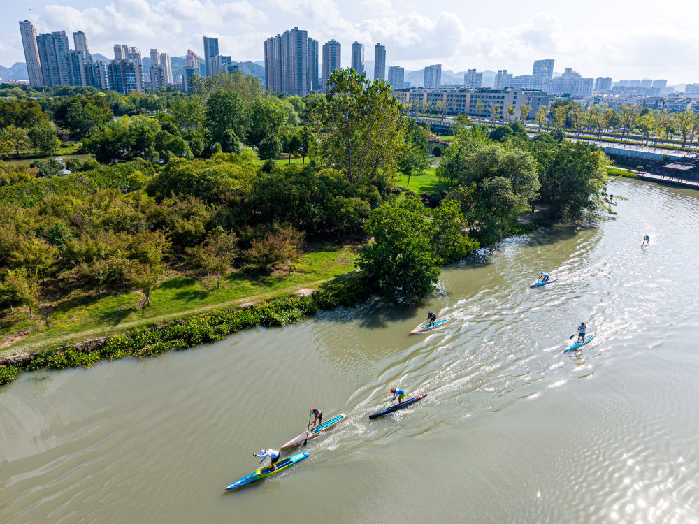 ↑10月11日,在浙江省温岭市九龙湖水域,桨板爱好者在粼粼碧波间挥桨竞渡。