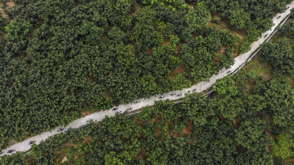↑8月8日,骑行爱好者在河北省遵化市苏家洼镇二道岭村骑行(无人机照片)。