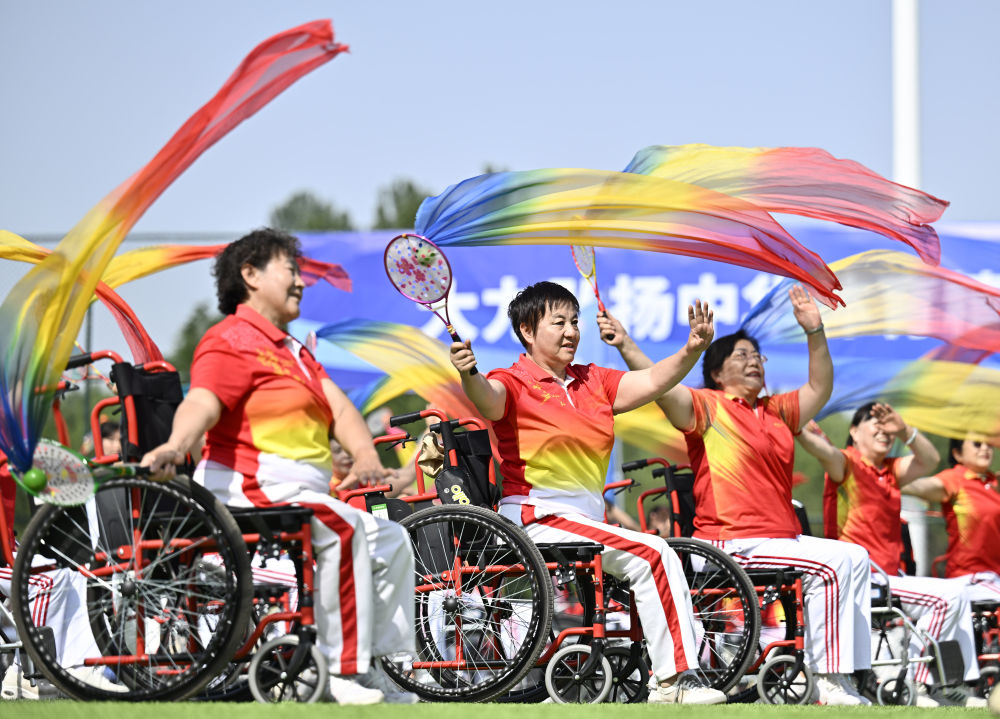 ↑6月10日,群众在银川市举行的一场全民健身主题活动中参加残疾人柔力球展演。