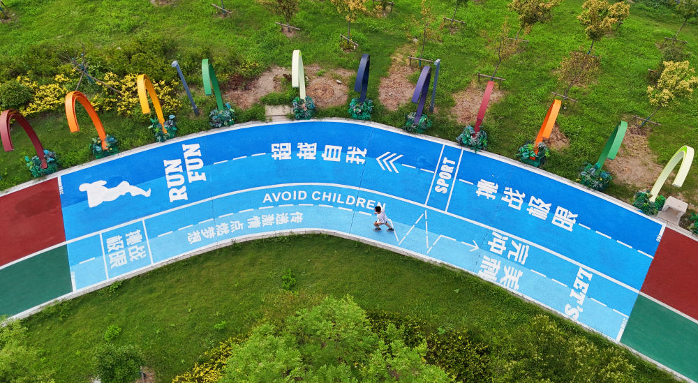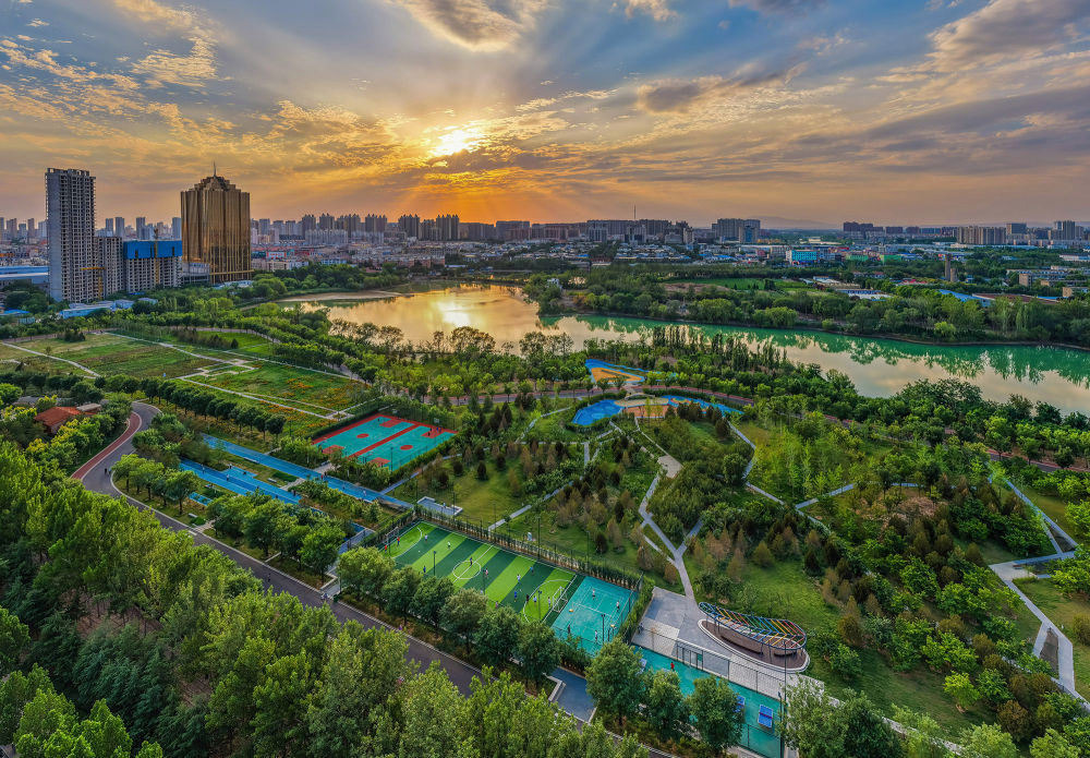↑ 6月5日,山西省运城市舜风公园水清岸绿、景色宜人,市民在公园的球场健身,乐享生态绿色生活。