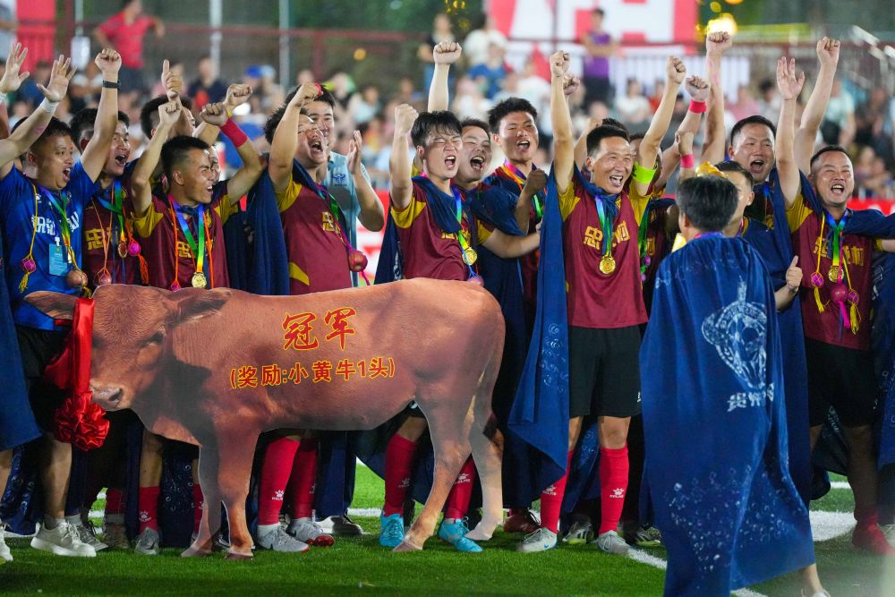 ↑8月9日,在位于贵州省黔东南州榕江县的“村超”足球场,忠诚村足球队夺得第三届贵州“村超”总决赛的总冠军。