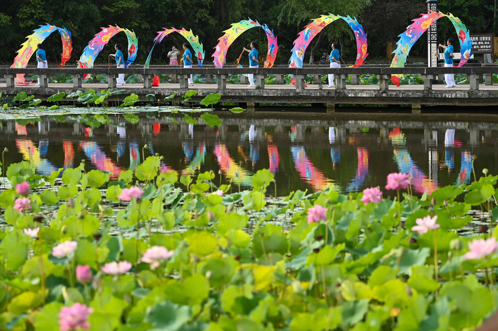 ↑ 8月6日,健身爱好者在四川省南充市蓬安县相如文化公园练习舞“彩带龙”。