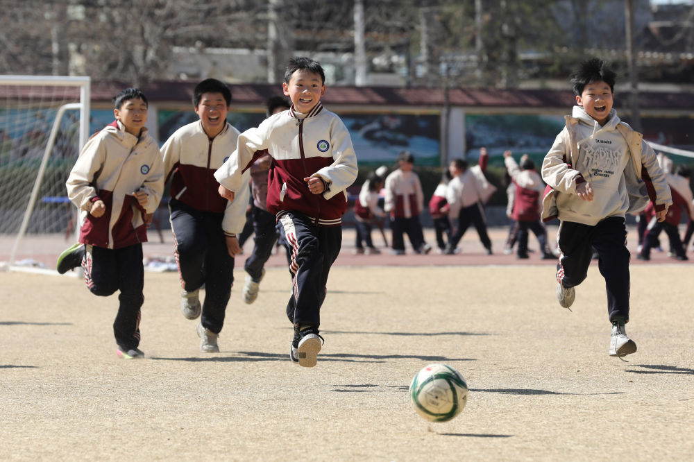 ↑3月20日,河南省焦作市温县第三实验小学学生在大课间踢足球。