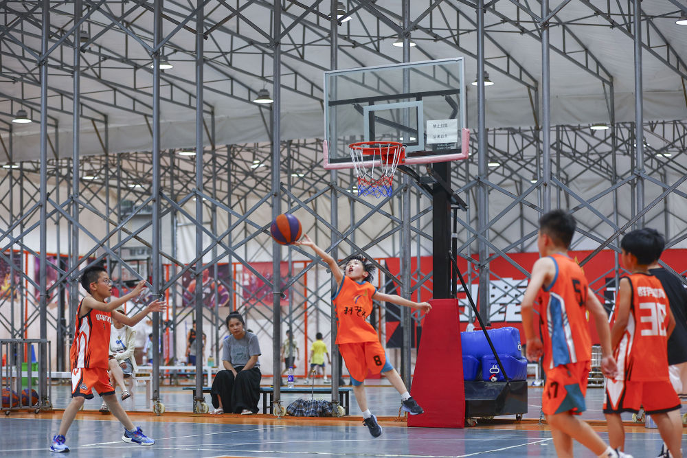 ↑7月16日,在浙江省温州市鹿城区白鹿运动场,孩子们进行篮球对抗赛。