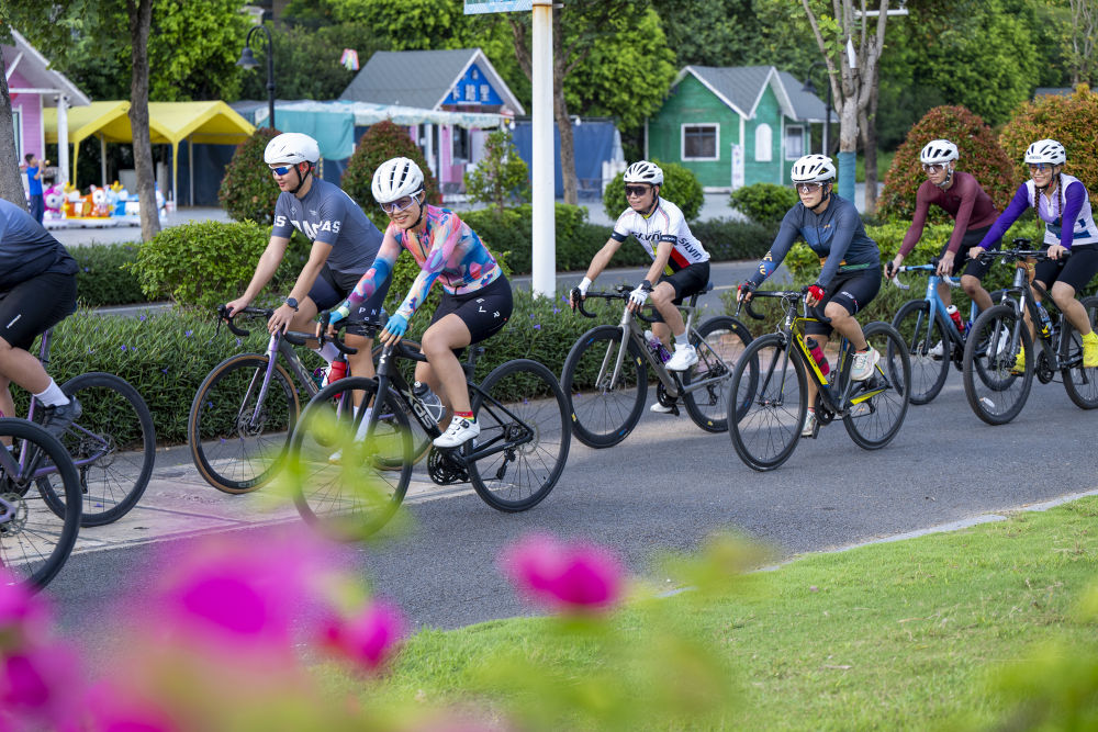 ↑9月14日,骑行爱好者在广西梧州市苍海公园湖道上骑行。