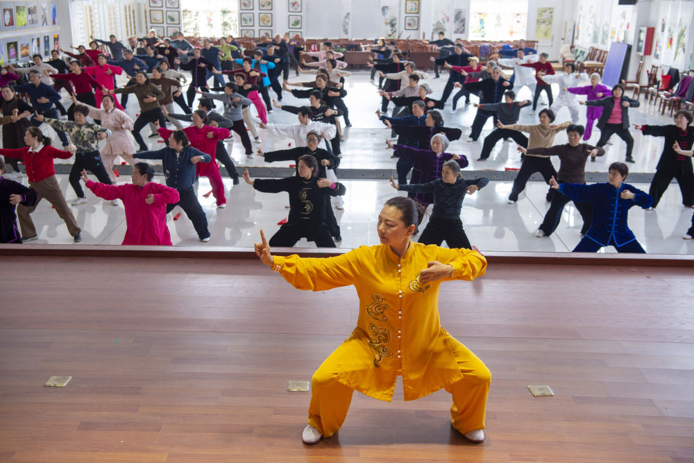 ↑3月24日,在江苏省海安市老年大学海安高新区分校,指导老师徐晓梅带领学员习练健身气功八段锦。