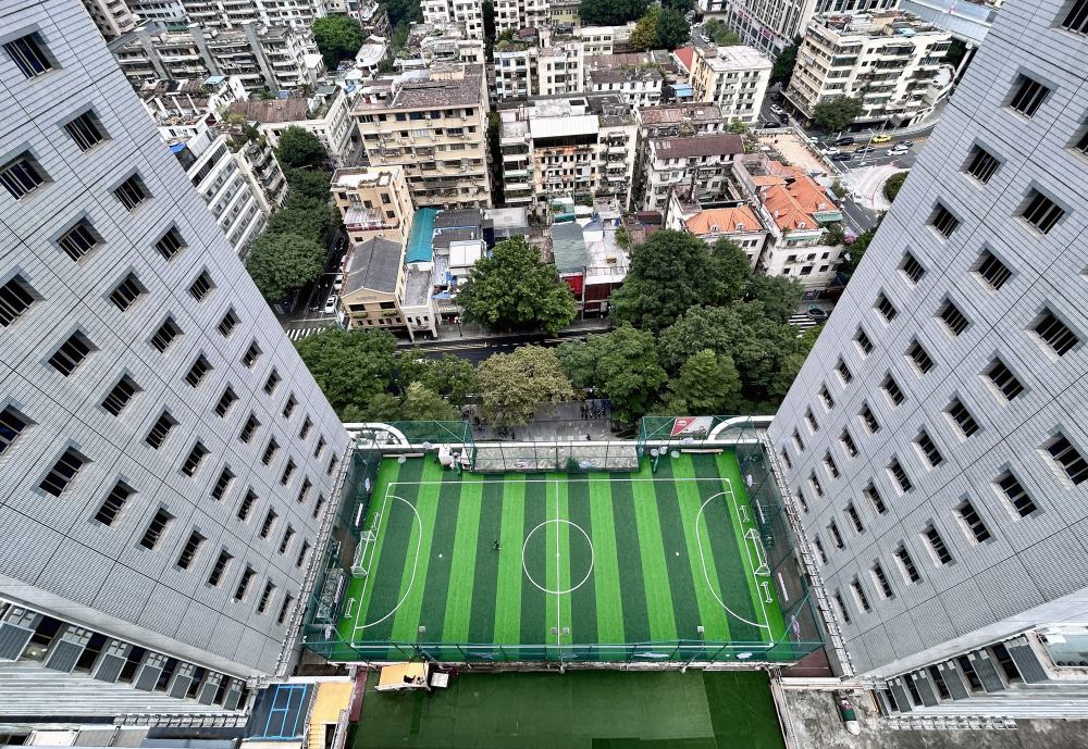 ↑11月3日拍摄的位于广州市越秀区江湾阳光天地的麦斐体育足球场,该足球场是由两栋楼间的天台改造而成。