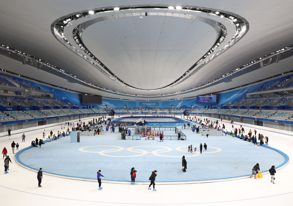 ↑1月4日,人们在北京国家速滑馆体验滑冰。