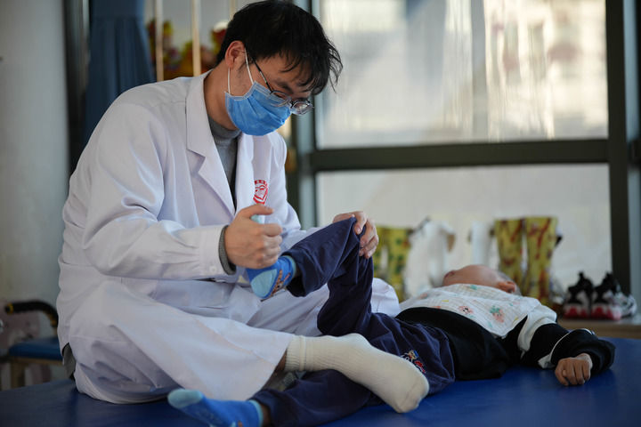 2月5日,一位福利院的老师正在给孩子进行肢体康复训练。新华每日电讯记者 谢晗 摄
