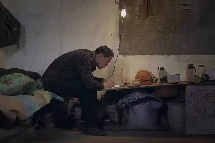 2014年冬天,陈年喜在矿山工棚里写作。(受访者供图)