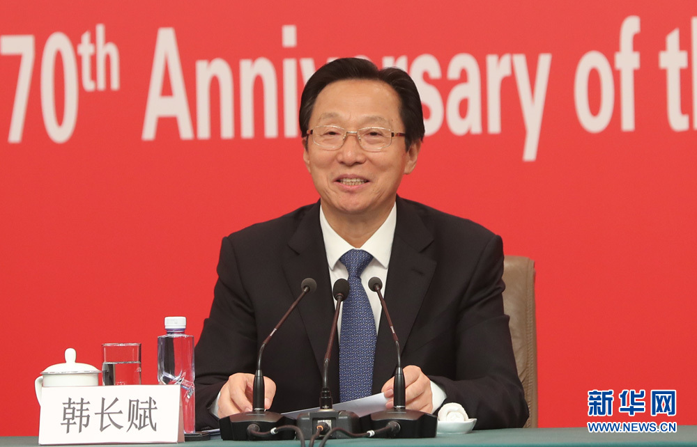 9月27日,庆祝中华人民共和国成立70周年活动新闻中心在梅地亚中心二层新闻发布厅举办第三场新闻发布会,中央农村工作领导小组办公室主任、农业农村部部长韩长赋,国务院扶贫开发领导小组办公室主任刘永富介绍全面建成小康社会,扎实推进脱贫攻坚和乡村振兴,并回答记者提问。图为韩长赋介绍有关情况。新华网 陈杰 摄