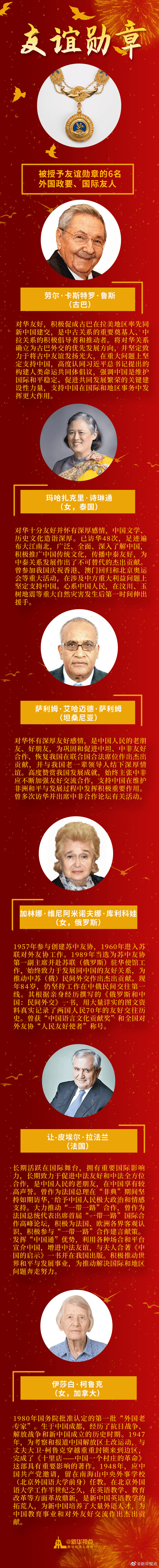 劳尔·卡斯特罗·鲁斯、玛哈扎克里·诗琳通等6人被授予“友谊勋章”。他们与中国结下不解情缘,留下一段段佳话。为他们点赞⬇