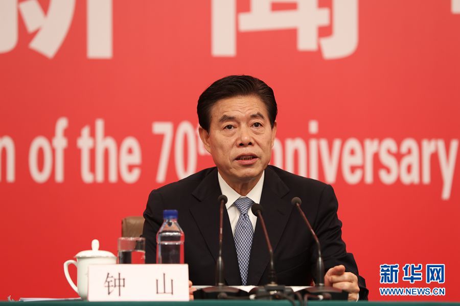 9月29日,庆祝中华人民共和国成立70周年活动新闻中心在北京梅地亚中心二层新闻发布厅举办第五场新闻发布会。图为商务部部长钟山介绍相关情况。新华网记者 郭小天 摄