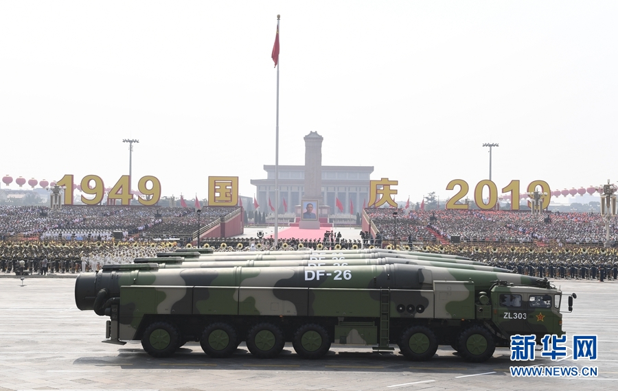10月1日上午,庆祝中华人民共和国成立70周年大会在北京天安门广场隆重举行。这是东风-26核常兼备导弹方队接受检阅。 新华社记者 高洁 摄