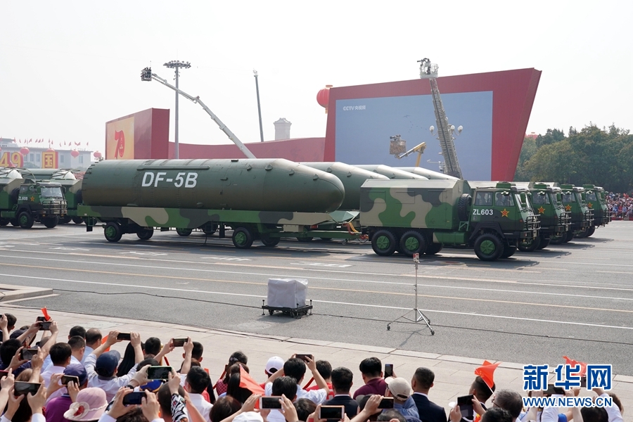 10月1日上午,庆祝中华人民共和国成立70周年大会在北京天安门广场隆重举行。这是东风-5B核导弹方队。 新华社记者 杨世尧 摄
