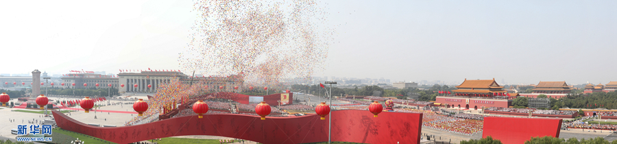 10月1日上午,庆祝中华人民共和国成立70周年大会在北京天安门广场隆重举行。这是天安门广场上放飞气球(拼接照片)。 新华社记者 金立旺 摄