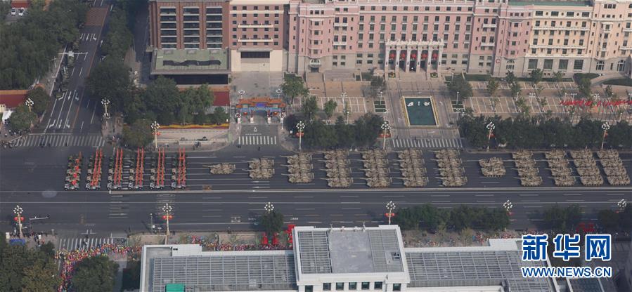 这是10月1日11时25分航拍的受阅战旗方队和坦克方队。10月1日,中华人民共和国喜迎七十华诞,举国欢庆。新华社记者用镜头记录下难忘的首都北京国庆24小时,留下永恒记忆。新华社记者 韩明坤 摄