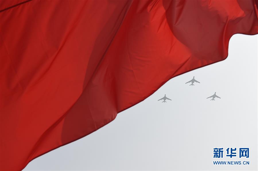 这是10月1日11时28分拍摄的轰炸机梯队。10月1日,中华人民共和国喜迎七十华诞,举国欢庆。新华社记者用镜头记录下难忘的首都北京国庆24小时,留下永恒记忆。新华社记者 陶亮 摄