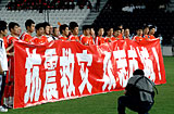 中国队战平卡塔尔 赛前展示横幅鼓励灾区人民