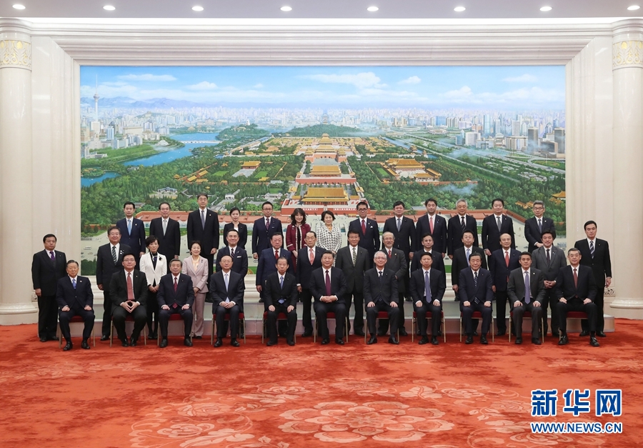 会见后,习近平与参加中日执政党交流机制第七次会议部分日方代表合影留念。