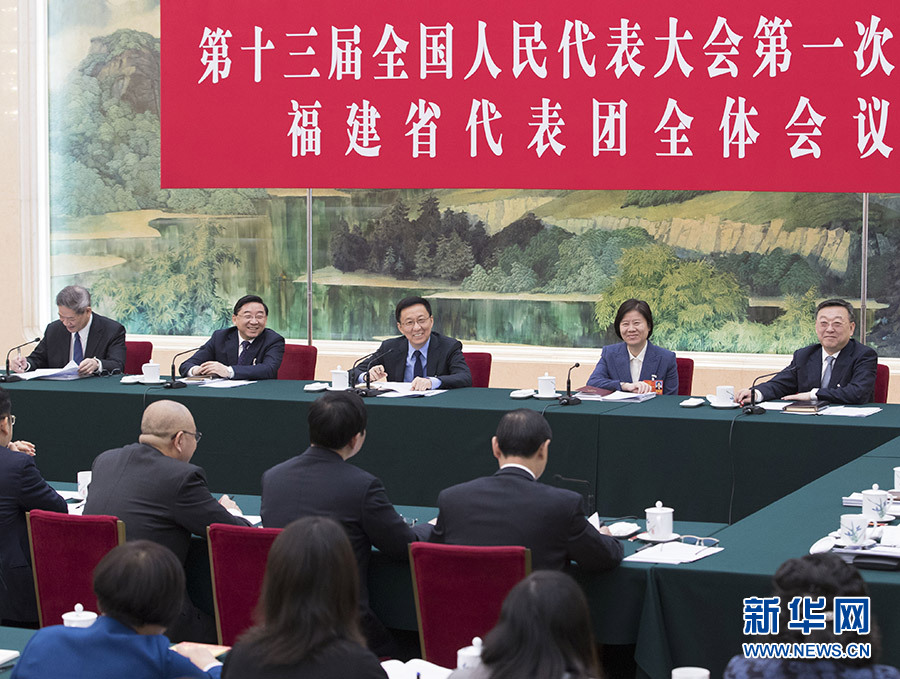3月8日,中共中央政治局常委韩正参加十三届全国人大一次会议福建代表团的审议。 新华社记者 王晔 摄