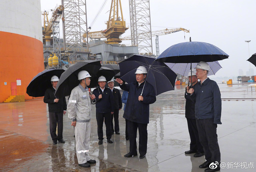 6月13日下午,习近平冒雨来到中集来福士海洋工程有限公司烟台基地。“蓝鲸1号”钻井平台巍峨伫立、“泰山”龙门吊高耸入云,习近平撑着伞边走边看,详细了解企业走自主创新发展之路、开展高端海洋工程设备自主设计研发制造情况。听说“蓝鲸1号”去年创造了可燃冰开采时间和产量两项世界纪录,习近平鼓励他们继续努力。总书记同现场的工人们一一握手,他说,基础的、核心的东西是讨不来买不来的,要靠我们自力更生、自主创新来实现。我看你们有这个信心,希望你们迎难而上、再接再厉。(记者张晓松、谢环驰)