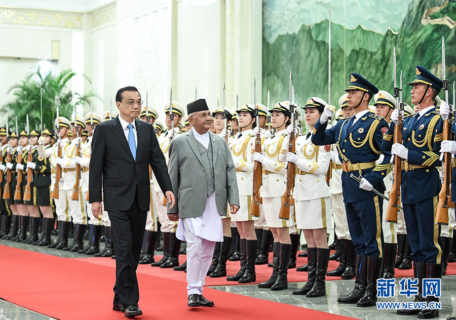 6月21日,国务院总理李克强在北京人民大会堂同来华进行正式访问的尼泊尔总理奥利举行会谈。这是会谈前,李克强在人民大会堂北大厅为奥利举行欢迎仪式。新华社记者 申宏 摄