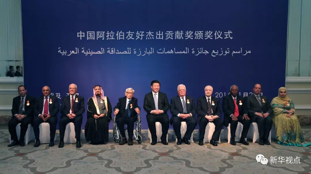 2016年1月20日,国家主席习近平在开罗会见联合国前秘书长加利等10名获得“中国阿拉伯友好杰出贡献奖”的友好人士并同他们合影留念。新华社记者庞兴雷摄
