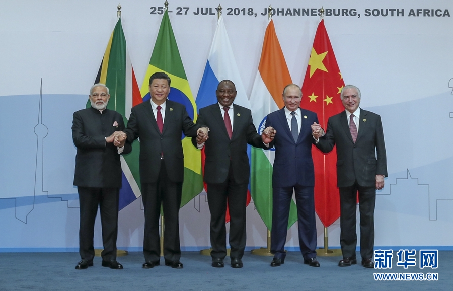 7月26日,金砖国家领导人第十次会晤在南非约翰内斯堡举行。南非总统拉马福萨主持。中国国家主席习近平、巴西总统特梅尔、俄罗斯总统普京、印度总理莫迪出席。这是五国领导人合影。 新华社记者 谢环驰 摄