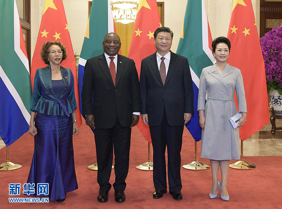 9月2日,国家主席习近平在北京人民大会堂同南非总统拉马福萨举行会谈。这是习近平和夫人彭丽媛同拉马福萨夫妇合影。 新华社记者 李学仁 摄