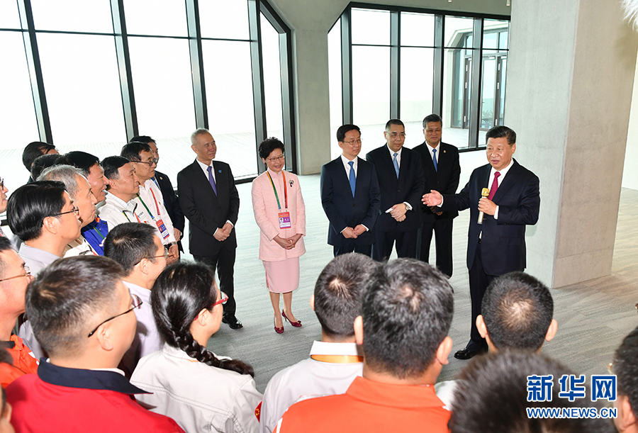 10月23日上午,港珠澳大桥开通仪式在广东省珠海市举行。中共中央总书记、国家主席、中央军委主席习近平出席仪式,宣布大桥正式开通并巡览大桥。这是习近平会见大桥管理和施工等方面的代表,同他们亲切交谈。 新华社记者殷博古摄