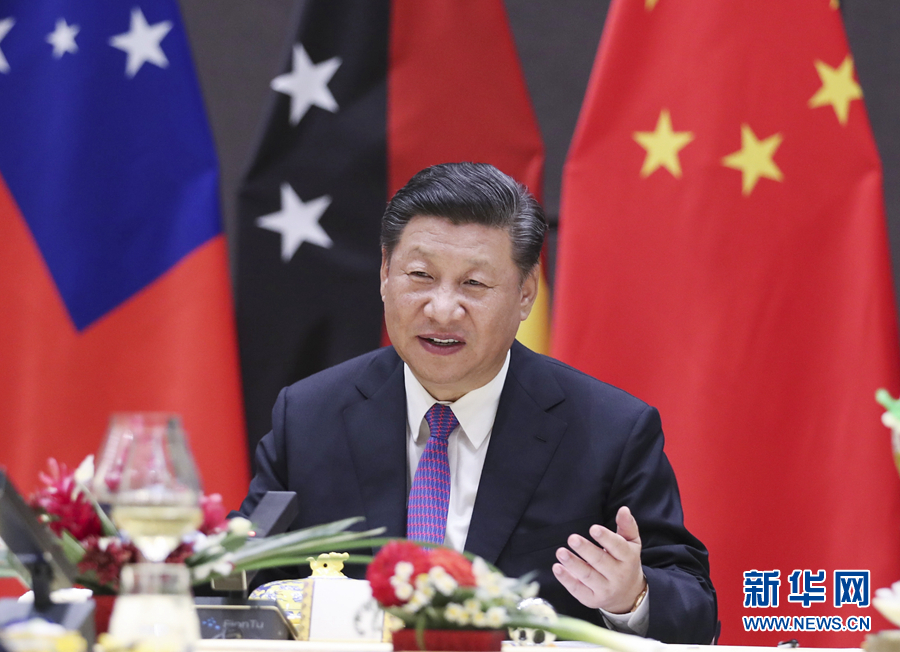 11月16日,国家主席习近平在莫尔兹比港同巴布亚新几内亚总理奥尼尔、密克罗尼西亚联邦总统克里斯琴、萨摩亚总理图伊拉埃帕、瓦努阿图总理萨尔瓦伊、库克群岛总理普纳、汤加首相波希瓦、纽埃总理塔拉吉等建交太平洋岛国领导人以及斐济政府代表、国防部长昆布安博拉举行集体会晤。习近平主持会晤并发表主旨讲话。 新华社记者 谢环驰 摄