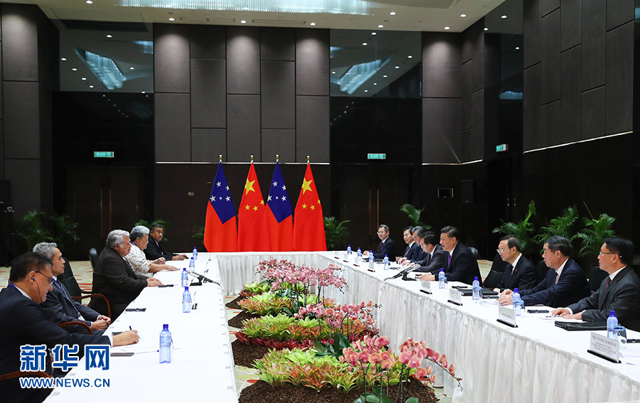 11月16日,国家主席习近平在莫尔兹比港分别会见建交太平洋岛国领导人。这是习近平会见萨摩亚总理图伊拉埃帕。 新华社记者 谢环驰 摄
