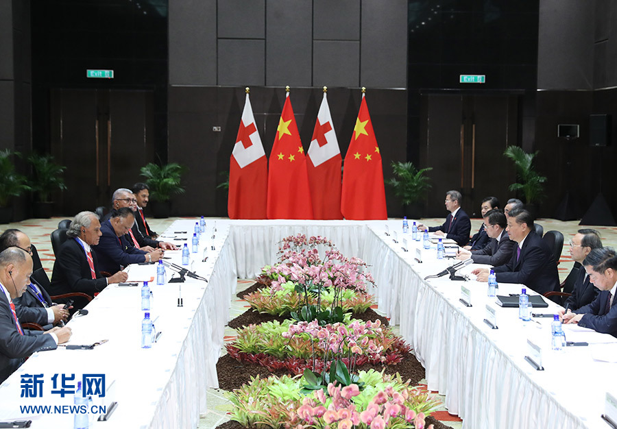 11月16日,国家主席习近平在莫尔兹比港分别会见建交太平洋岛国领导人。这是习近平会见汤加首相波希瓦。 新华社记者 丁林 摄