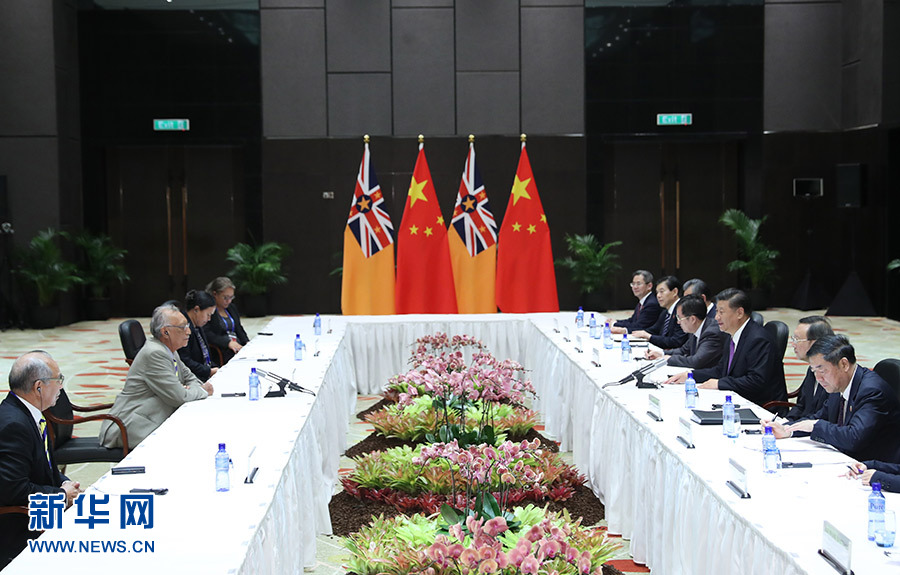 11月16日,国家主席习近平在莫尔兹比港分别会见建交太平洋岛国领导人。这是习近平会见纽埃总理塔拉吉。 新华社记者 丁林 摄