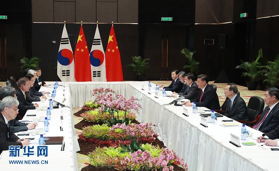 11月17日,国家主席习近平在莫尔兹比港会见韩国总统文在寅。 新华社记者 庞兴雷 摄