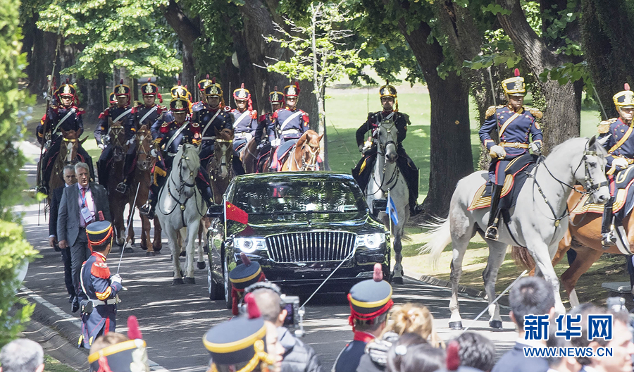 习近平和夫人彭丽媛在马队护卫下前往总统官邸,礼兵在林荫大道两侧列队接受检阅。抵达荣誉广场时,军乐团奏响欢快的进行曲。马克里和夫人阿瓦达上前热情迎接。两国元首夫妇登上检阅台。军乐团奏中国、阿根廷两国国歌。