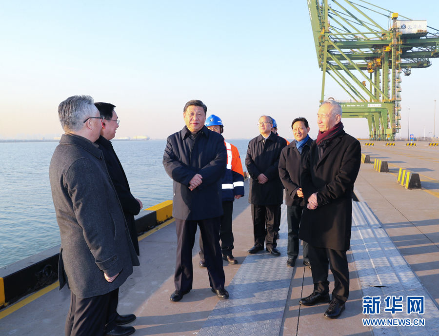 1月16日至18日,中共中央总书记、国家主席、中央军委主席习近平在京津冀考察,主持召开京津冀协同发展座谈会并发表重要讲话。这是1月17日下午,习近平在天津港码头考察。 新华社记者 谢环驰 摄