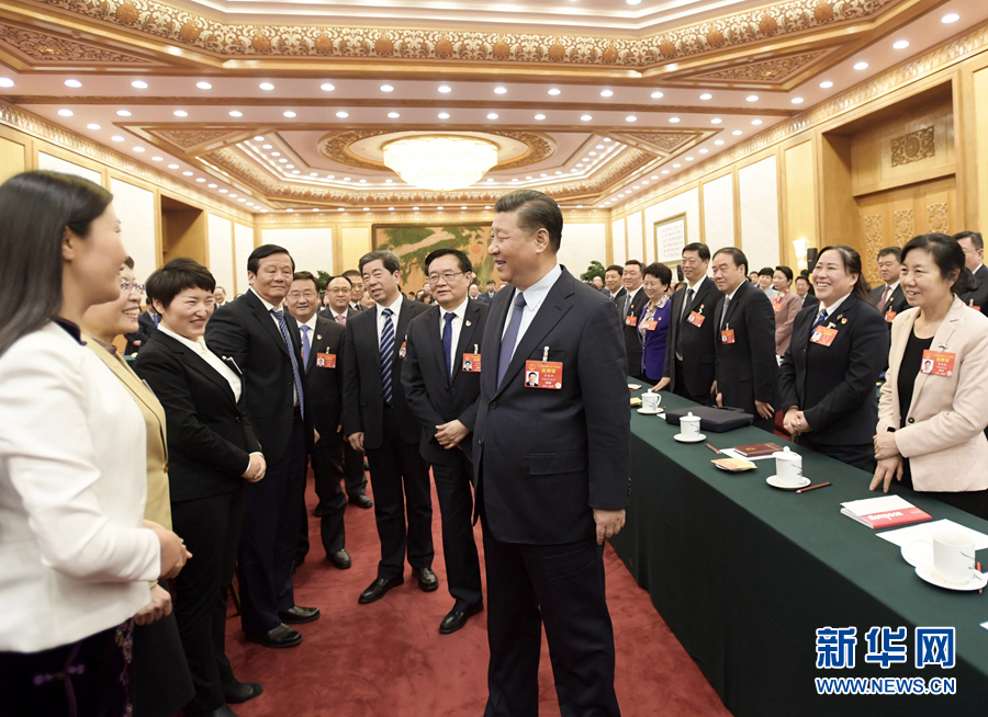 3月8日,中共中央总书记、国家主席、中央军委主席习近平参加十三届全国人大二次会议河南代表团的审议。在“三八”国际劳动妇女节到来之际,习近平代表党中央,向参加全国两会的女代表、女委员、女工作人员,向全国各族各界妇女,致以节日的祝贺和美好的祝福。这是习近平同女代表亲切交谈。新华社记者 李学仁 摄