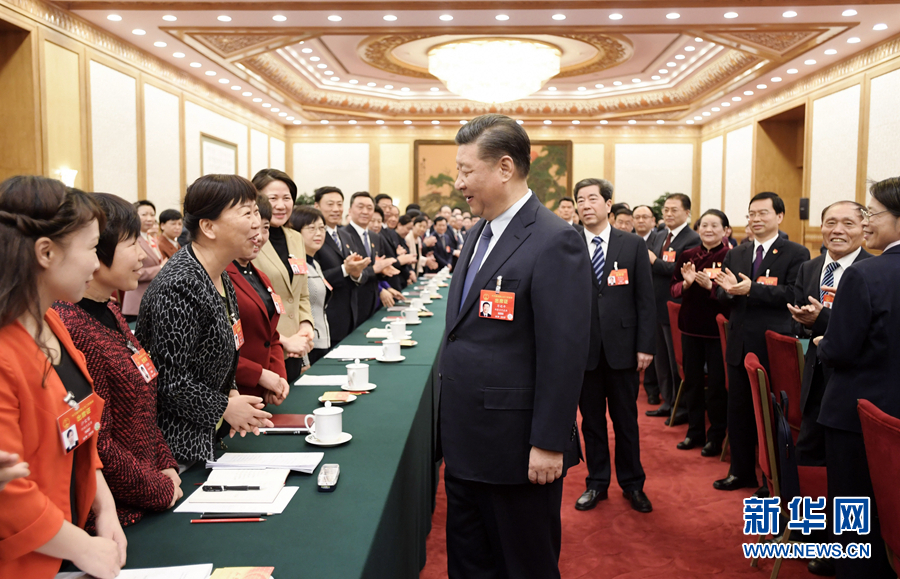 3月8日,中共中央总书记、国家主席、中央军委主席习近平参加十三届全国人大二次会议河南代表团的审议。在“三八”国际劳动妇女节到来之际,习近平代表党中央,向参加全国两会的女代表、女委员、女工作人员,向全国各族各界妇女,致以节日的祝贺和美好的祝福。这是习近平同女代表亲切握手。新华社记者 谢环驰 摄