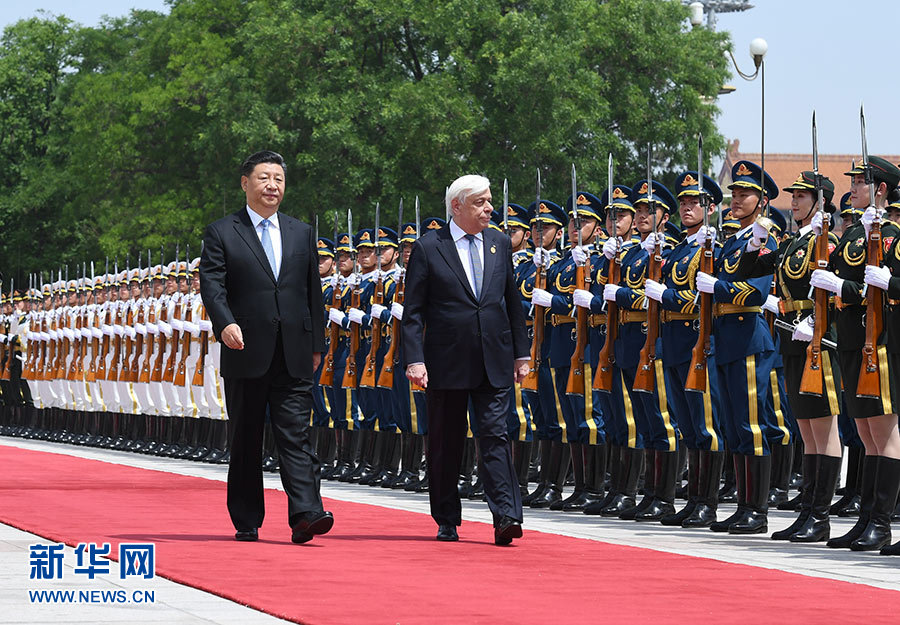 5月14日,国家主席习近平在北京人民大会堂同希腊总统帕夫洛普洛斯举行会谈。这是会谈前,习近平在人民大会堂东门外广场为帕夫洛普洛斯举行欢迎仪式。 新华社记者 张领 摄