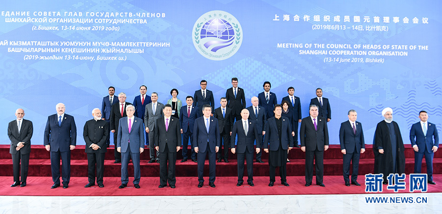 6月14日,上海合作组织成员国元首理事会第十九次会议在吉尔吉斯斯坦首都比什凯克举行。国家主席习近平同印度总理莫迪、哈萨克斯坦总统托卡耶夫、吉尔吉斯斯坦总统热恩别科夫、巴基斯坦总理伊姆兰·汗、俄罗斯总统普京、塔吉克斯坦总统拉赫蒙、乌兹别克斯坦总统米尔济约耶夫出席会议。习近平在会上发表重要讲话。这是大范围会谈后,与会各方集体合影。 新华社记者 殷博古 摄