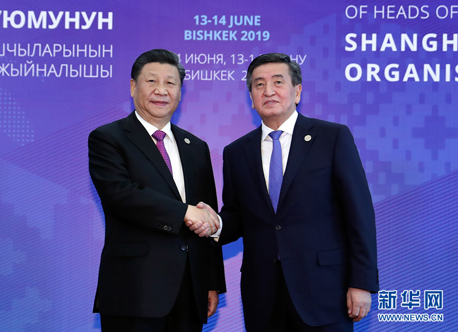 6月14日,国家主席习近平在吉尔吉斯斯坦首都比什凯克出席上海合作组织成员国元首理事会第十九次会议并发表重要讲话。这是习近平抵达阿拉尔恰国宾馆会议中心大厅,受到吉尔吉斯斯坦总统热恩别科夫热情迎接。 新华社记者 丁林 摄
