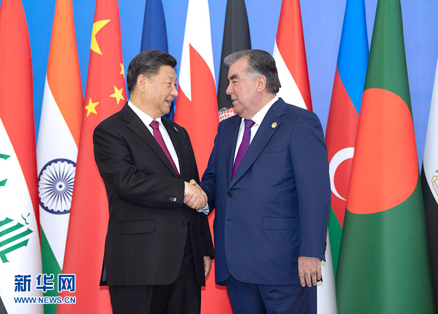 6月15日,亚洲相互协作与信任措施会议第五次峰会在塔吉克斯坦首都杜尚别举行。国家主席习近平出席峰会并发表重要讲话。这是习近平抵达纳乌鲁兹宫迎宾厅,受到塔吉克斯坦总统拉赫蒙热情迎接。 新华社记者 沙达提 摄