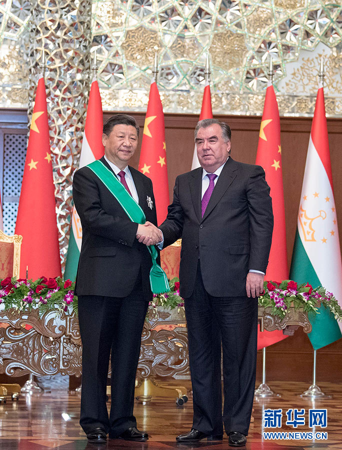 习近平出席仪式 接受塔吉克斯坦总统拉赫蒙授予“王冠勋章”