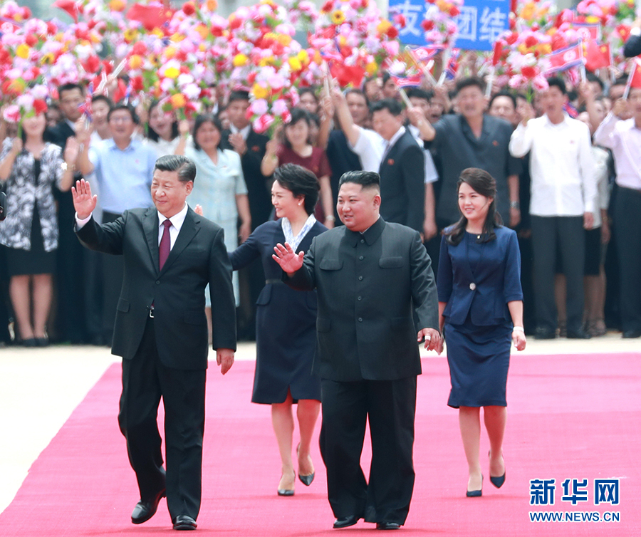 6月20日,中共中央总书记、国家主席习近平乘专机抵达平壤,开始对朝鲜民主主义人民共和国进行国事访问。朝鲜劳动党委员长、国务委员会委员长金正恩和夫人李雪主到机场热情迎接习近平和夫人彭丽媛。朝方在机场举行隆重欢迎仪式。 新华社记者 庞兴雷 摄