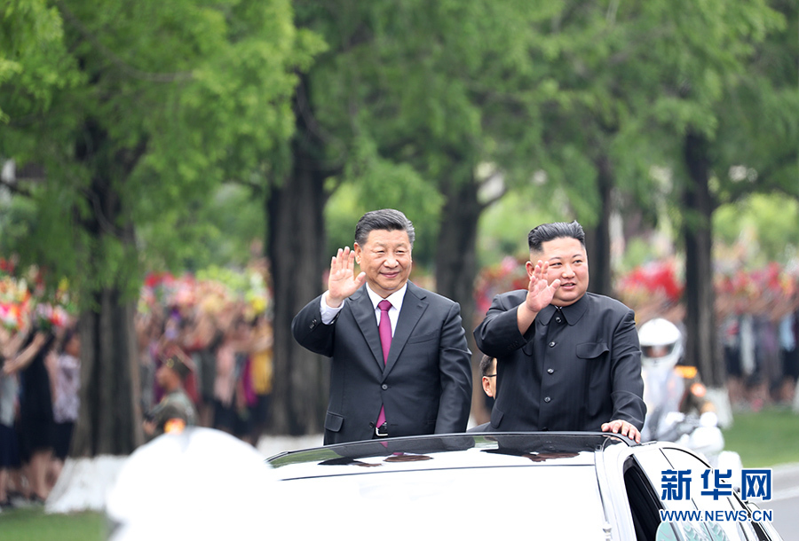 6月20日,中共中央总书记、国家主席习近平乘专机抵达平壤,开始对朝鲜民主主义人民共和国进行国事访问。朝鲜劳动党委员长、国务委员会委员长金正恩和夫人李雪主到机场热情迎接习近平和夫人彭丽媛。朝方在机场举行隆重欢迎仪式。欢迎仪式结束后,习近平与金正恩同车前往锦绣山太阳宫广场,沿途数十万群众夹道欢迎。 新华社记者 鞠鹏 摄