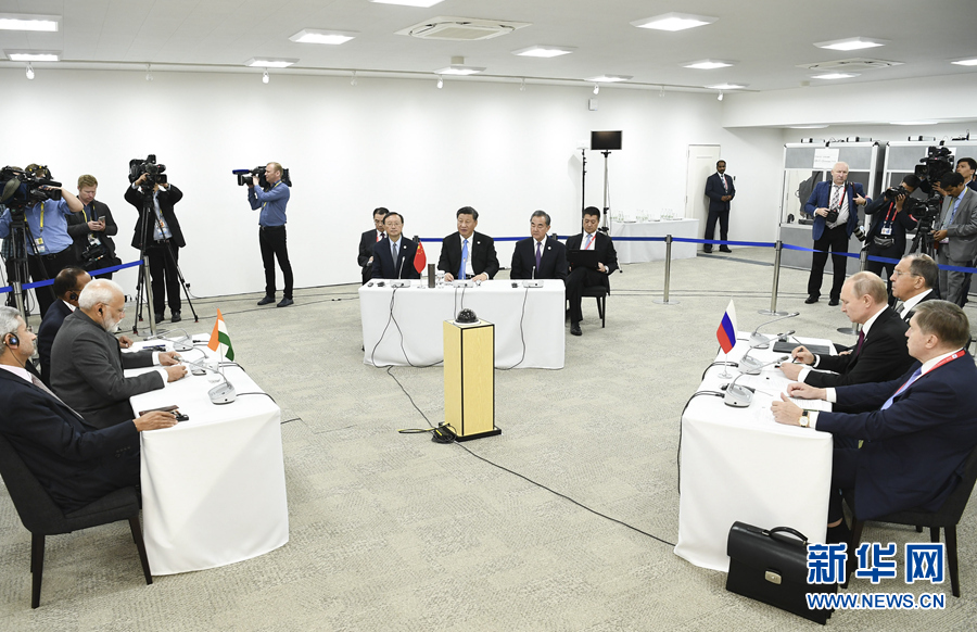 6月28日,国家主席习近平在大阪出席中俄印领导人会晤,同俄罗斯总统普京、印度总理莫迪就当前国际形势、重大国际和地区问题、三方合作深入交换意见。新华社记者 谢环驰 摄